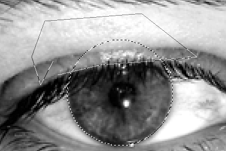 Шаг 2 Создаем новый слой и в свойствах слоя выбираем color. Теперь выберем инструмент Marquee tool для выделения глаза, а затем Polygon lasso tool удерживая клавишу ALT выбираем как показано на рисунке, таким образом, мы уберем выделение, которое не относится к зрачку глаза.