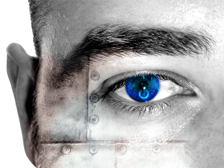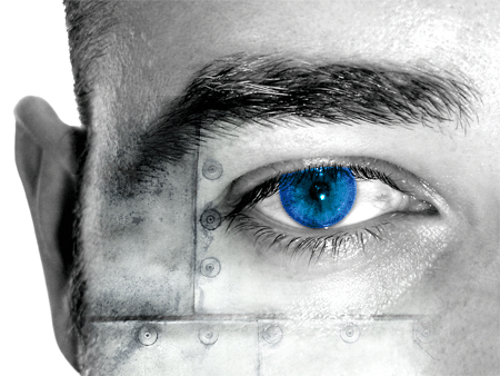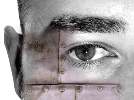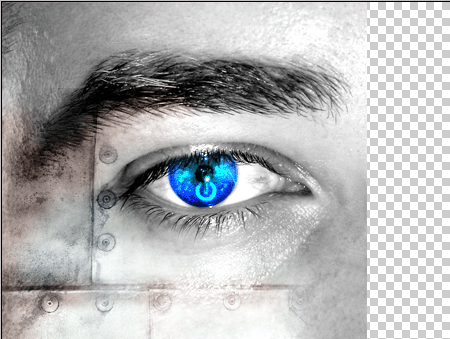 Шаг 8 Удерживая CTRL, щелкаем на нашей картинке, чтобы выделить нужный нам фрагмент. Вырезаем его, а потом вставляем поверх всего нашего изображения и размещаем его на нашем зрачке. В свойствах этого нового слоя ставим Overlay. С помощью резинки, удаляем ненужные нам элементы. Также, к нашему цветному основному слою, мы добавили немного красновато-коричневого цвета, чтобы придать эффект ржавчины нашей металлической структуре.